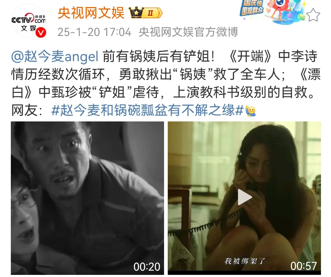 央视网文娱发文:前有锅姨后有铲姐!《开端》中李诗情历经数次循环,勇敢揪出“锅姨”救了全车人;《漂白》中甄珍被“铲姐”虐待,上演教科书级别的自救。